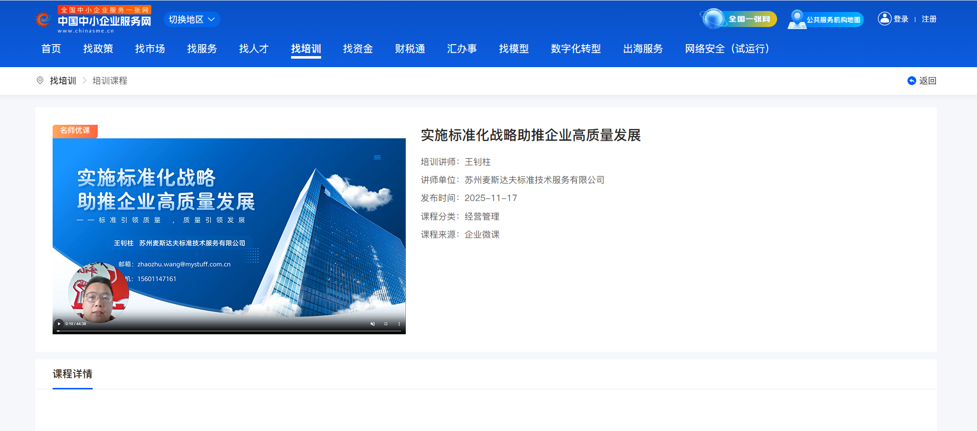 為貫徹落實黨中央、國務(wù)院關(guān)于促進中小企業(yè)發(fā)展的決策部署,加強中小企業(yè)人才培訓(xùn)公共服務(wù),工業(yè)和信息化部組織開展了2025年中小企業(yè)人才培訓(xùn)“名師優(yōu)課”征集遴選工作。經(jīng)過社會征集、地方推薦、企業(yè)家評選及專家評審等多個環(huán)節(jié),遴選出100門優(yōu)質(zhì)課程。其中,麥斯達夫(蘇州)科技集團有限公司總經(jīng)理王釗柱主講的《實施標(biāo)準(zhǔn)化戰(zhàn)略助推企業(yè)高質(zhì)量發(fā)展》課程成功入選,并成為本次唯一一門聚焦標(biāo)準(zhǔn)化領(lǐng)域的“名師優(yōu)課”。