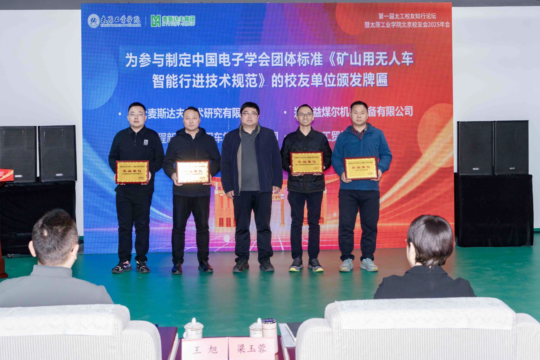自動化系副主任喬俊福對太工首次作為主編單位的標(biāo)準(zhǔn)——中國電子學(xué)會團(tuán)體標(biāo)準(zhǔn)《礦山用無人車智能行進(jìn)技術(shù)規(guī)范》(T/CIE 360—2025)進(jìn)行宣貫解讀,并為參與標(biāo)準(zhǔn)編制的四家校友單位頒發(fā)榮譽(yù)牌匾,表彰其在推動礦山用無人車領(lǐng)域標(biāo)準(zhǔn)化建設(shè)中的貢獻(xiàn)。
