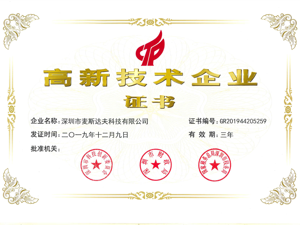 2019年12月9日,深圳市麥斯達夫科技有限公司獲批“國家高新技術(shù)企業(yè)”稱號。