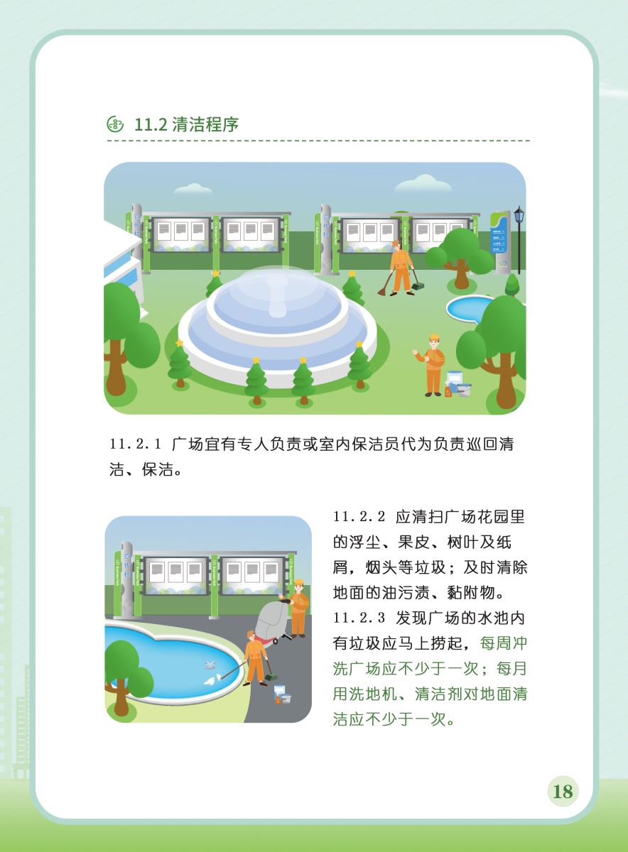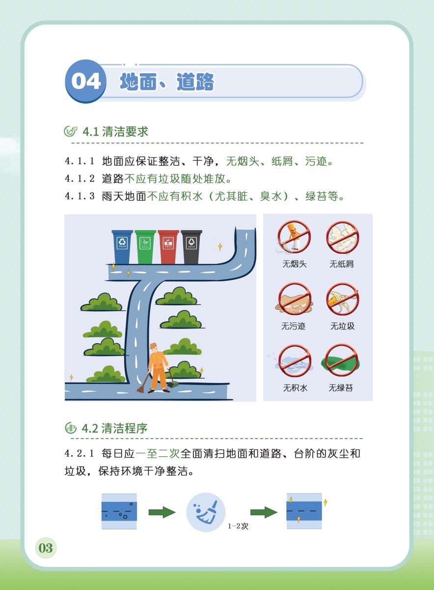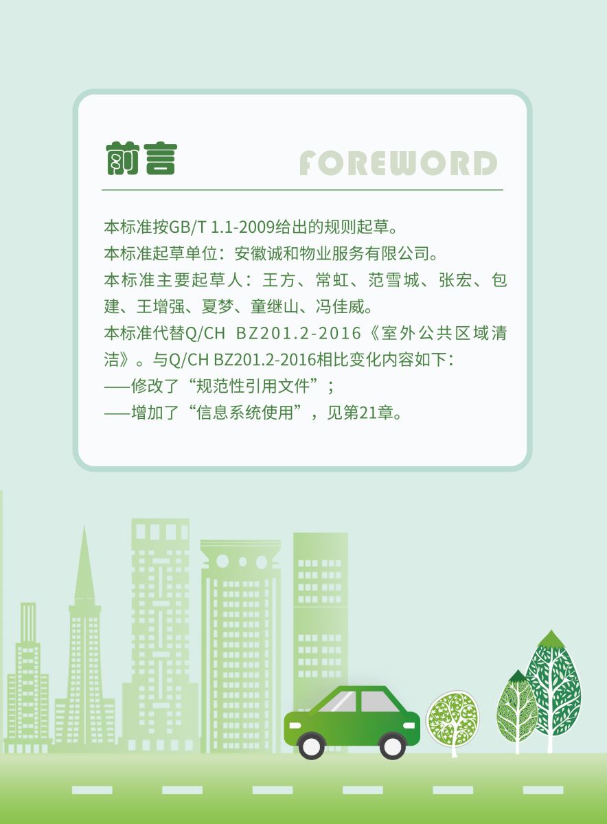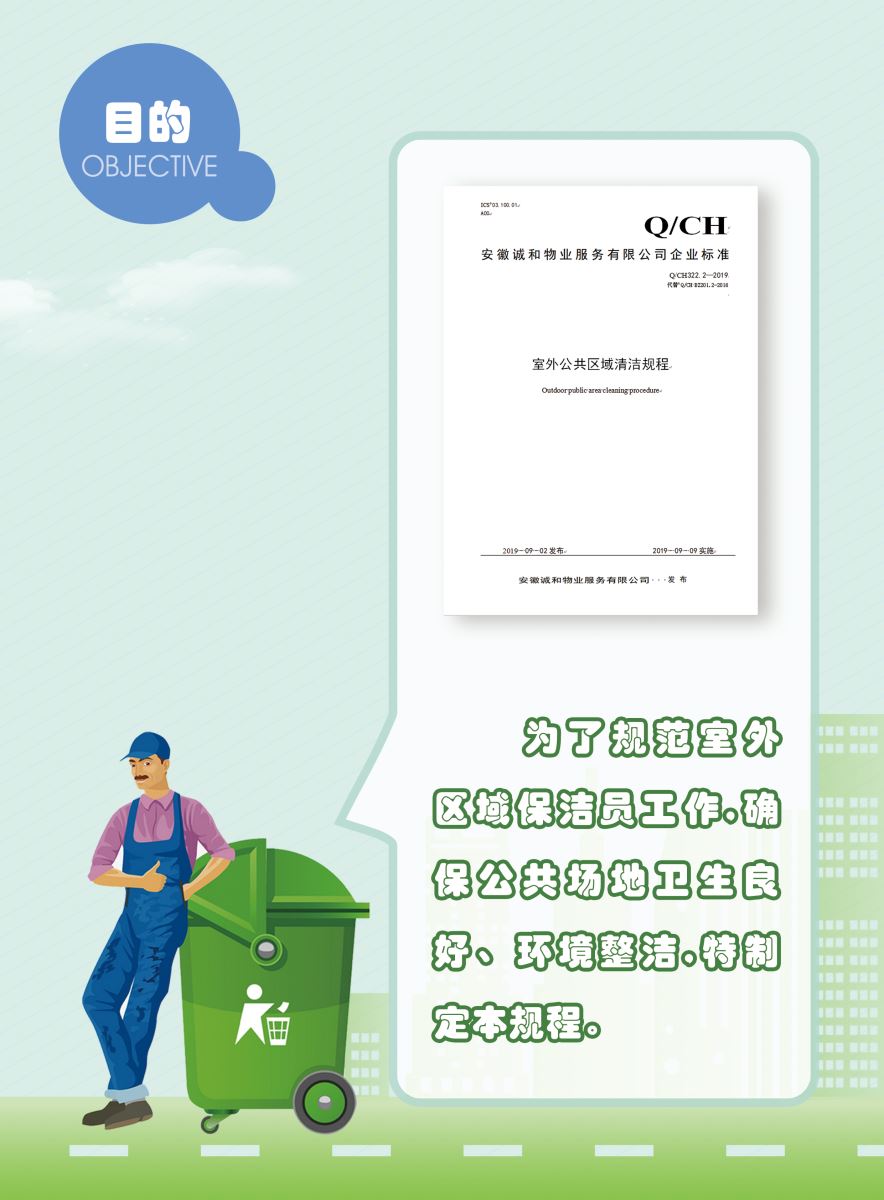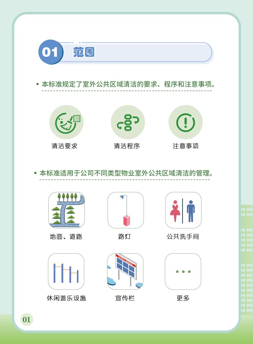以下展示《室外公共區(qū)域清潔規(guī)程》團體標準圖解版,以供業(yè)內同仁閱覽,不足之處,敬請批評指正。