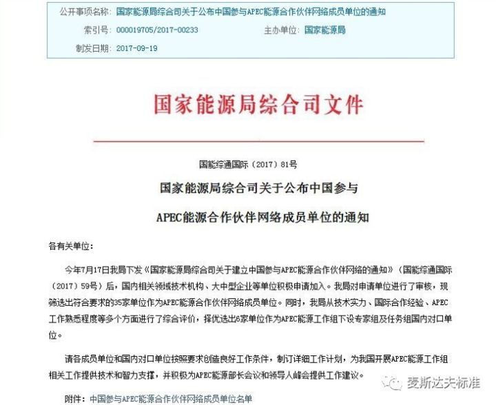 2017年9月19日,國家能源局下發(fā)《國家能源局綜合司關(guān)于建立中國參與APEC能源合作伙伴網(wǎng)絡(luò)的通知》(國能綜通國際〔2017〕59號(hào)),公布了通過篩選審核的35家APEC能源合作伙伴網(wǎng)絡(luò)成員單位。北京麥斯達(dá)夫公司赫然在列。