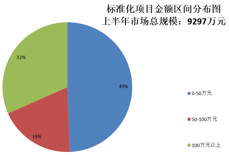 從表3、圖3可見,2018年1-6月,麥斯達(dá)夫統(tǒng)計的標(biāo)準(zhǔn)化服務(wù)業(yè)市場總規(guī)模為9297萬元,其中項目金額處于0-50萬元區(qū)間的項目最多,共計39個,占項目總數(shù)的49.4%。