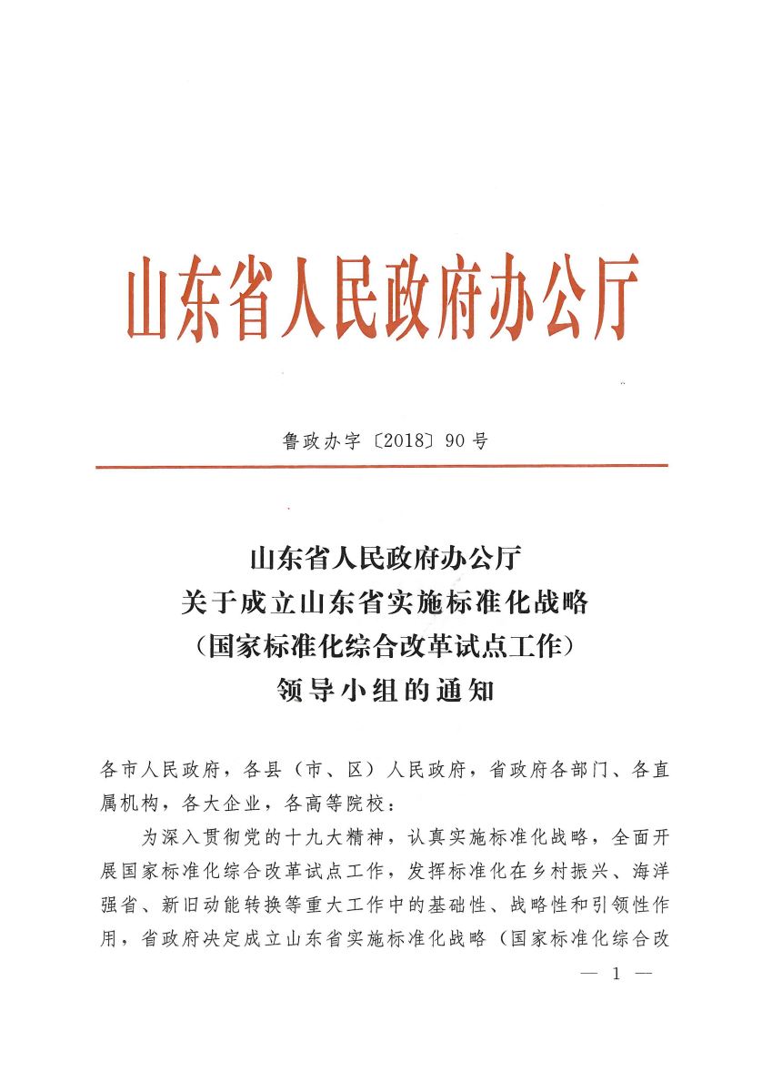 山東省人民政府辦公廳關(guān)于成立山東省實(shí)施標(biāo)準(zhǔn)化戰(zhàn)略(國(guó)家標(biāo)準(zhǔn)化綜合改革試點(diǎn)工作)領(lǐng)導(dǎo)小組的通知