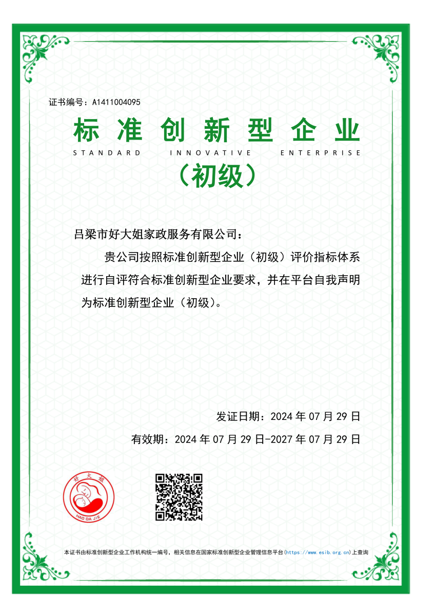 呂梁市好大姐家政服務有限公司獲評標準創(chuàng)新型企業(yè)
