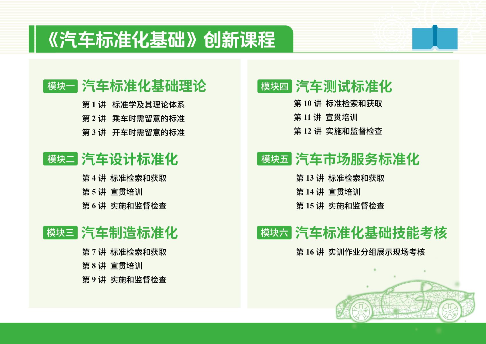 《汽車標(biāo)準(zhǔn)化基礎(chǔ)》課程共設(shè)16講、32課時(shí),自本學(xué)期起正式納入蘇州職業(yè)技術(shù)大學(xué)機(jī)電工程學(xué)院“汽車標(biāo)準(zhǔn)化技術(shù)”微專業(yè)核心課程體系。麥斯達(dá)夫集團(tuán)全面負(fù)責(zé)課程的教學(xué)實(shí)施,包括授課師資配備、課件教材開發(fā)、實(shí)訓(xùn)教具準(zhǔn)備、課程標(biāo)準(zhǔn)制定、課后習(xí)題組編、線上微課錄制和考核體系設(shè)計(jì)等環(huán)節(jié),全方位保障課程質(zhì)量和教學(xué)效果。
